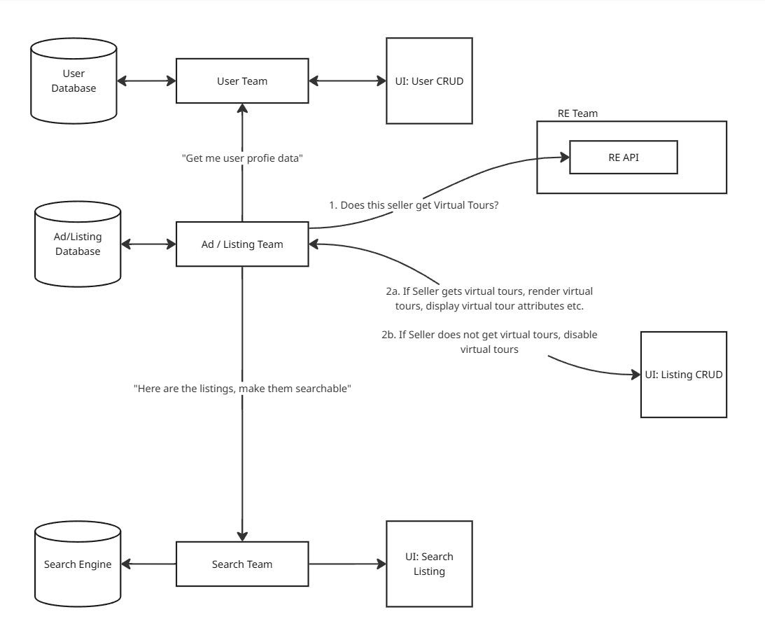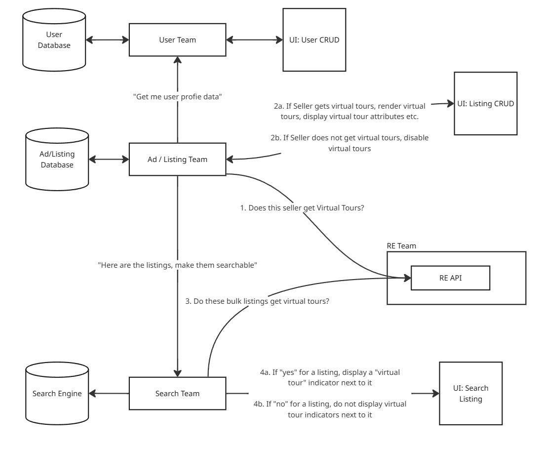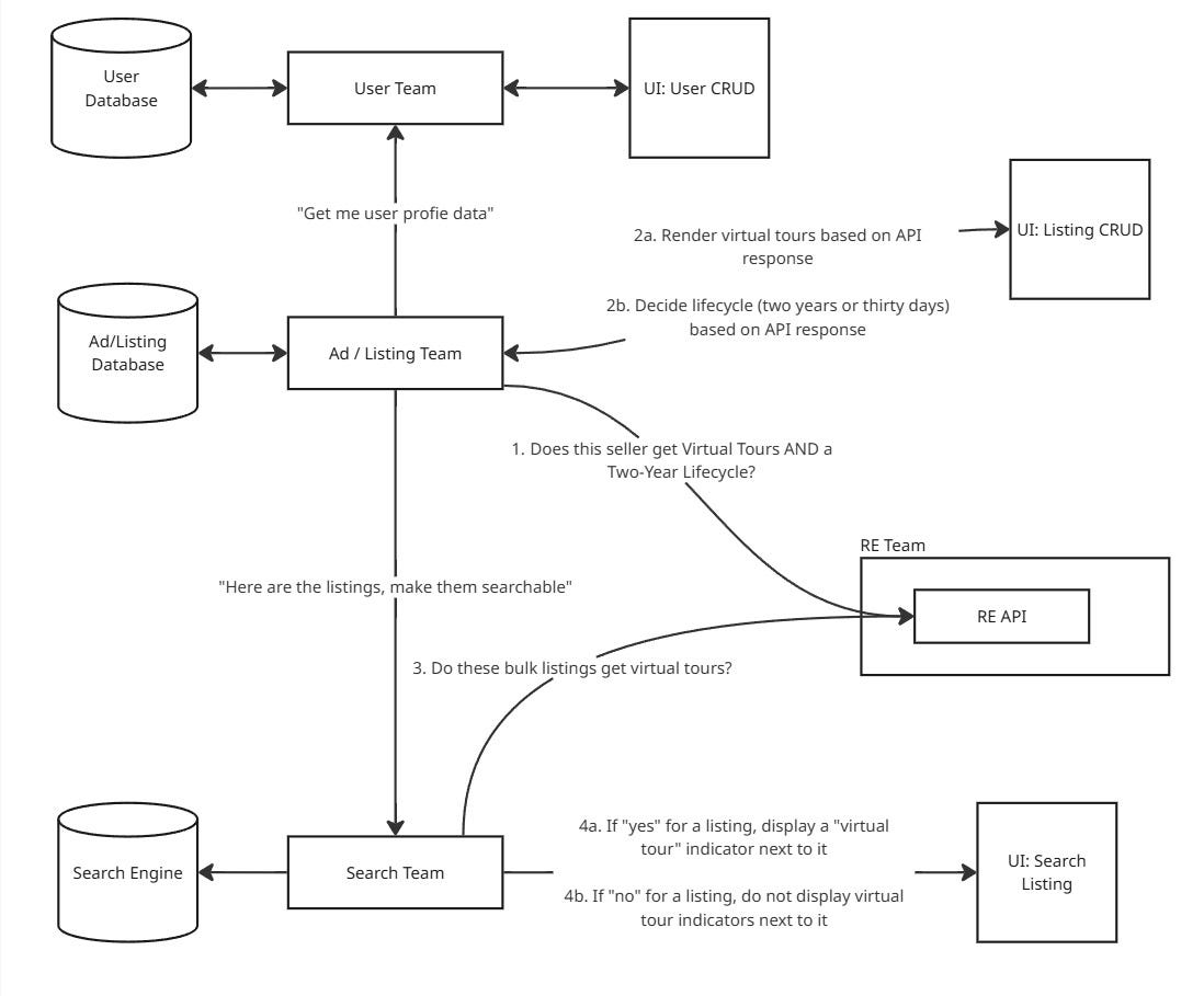 In order to make this happen, an API integration between the Listing Team and the RE team needed to take place. The monthly subscription product offering was being developed by the RE devs. They were managing the subscripion lifecycles and wanted the Listing Team to call one of their APIs to check if a seller would be eligible for virtual tours. If the API said “Yes”, then their listings would display the feature, they would be able to add/edit virtual tour details, etc. If the API said “No”, then the virtual tours would be disabled. In addition, the RE Team also wanted to retain the virtual tour attributes in the database even if a seller’s subscription was cancelled, because they could renew their subscription any time and would be immediatley able to use the feature.