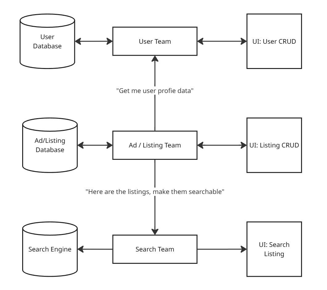 Since there were only three teams, meetings did not usually take long. It was easy to reach a consensus on design and architecture by simply talking to one or two engineers from another team. Feature prioritisation was also quick - product managers and engineers literally worked side-by-side to get things done. The user team were taking care of all user profile-related things (i.e., account creation, profile management), the ad/listing team was focused on sellers and making the listing experience as smooth as possible, and the search team was making sure buyers could find those listings as efficiently as possible. Things were moving fast - they were shipping business values within days, sometimes even within hours!